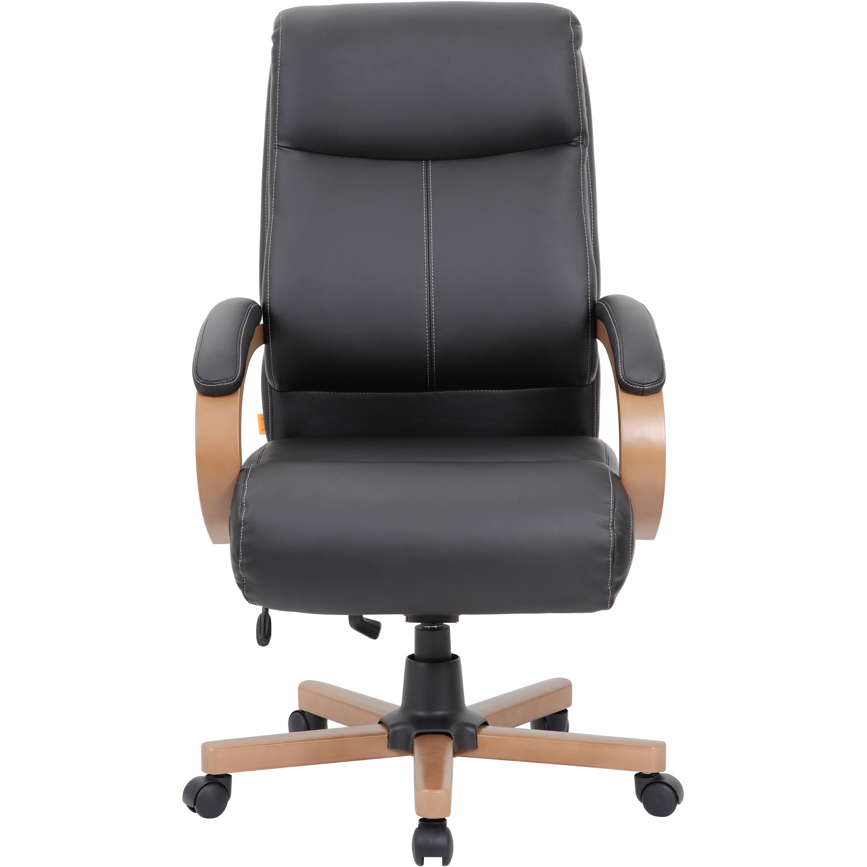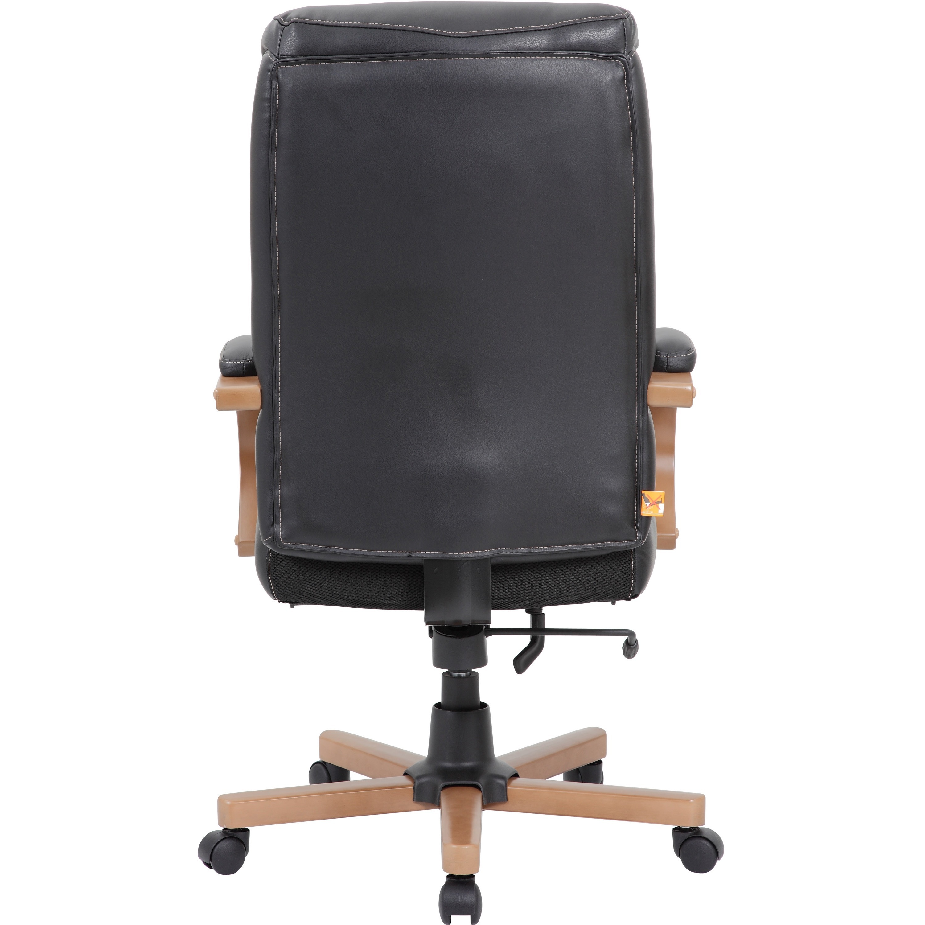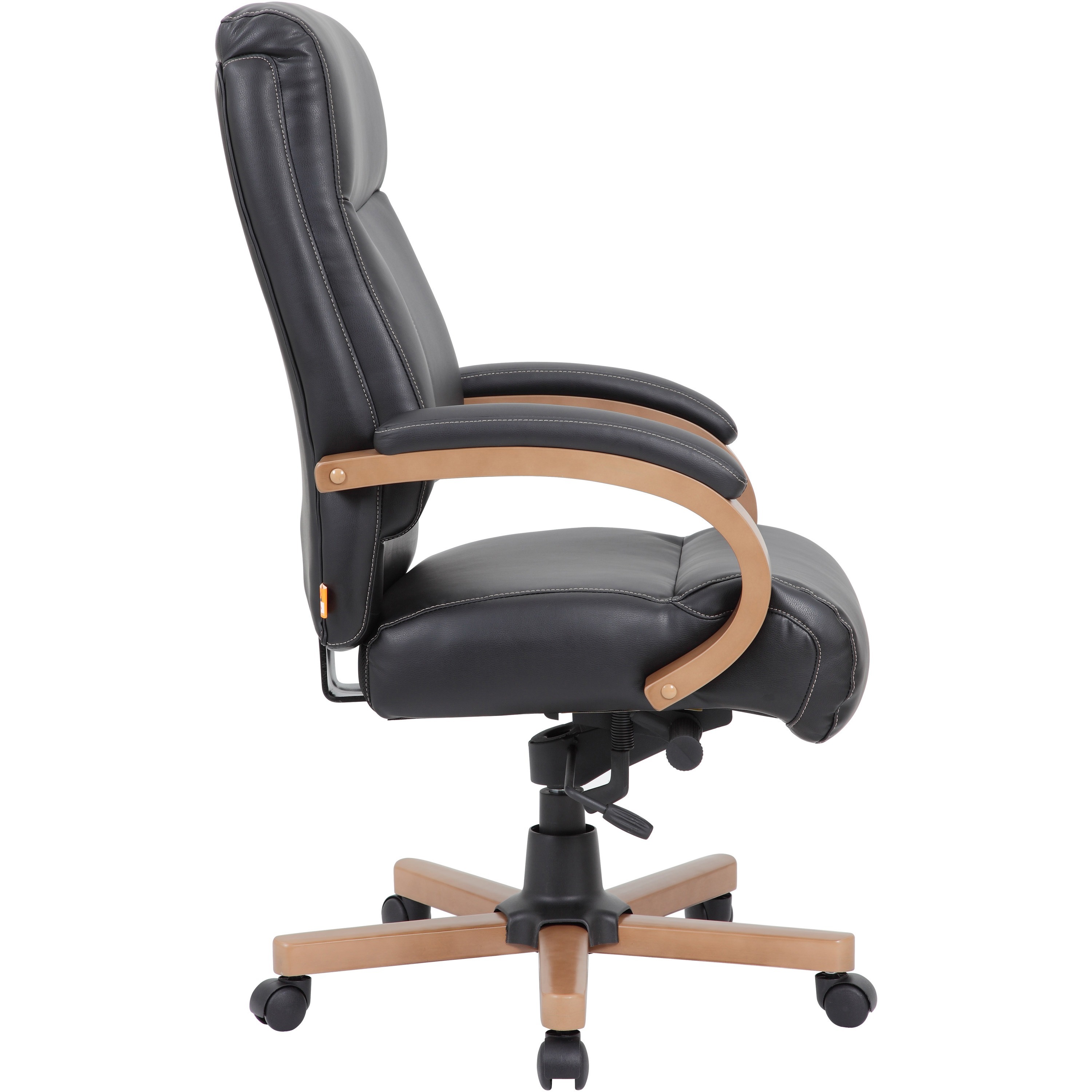 | Marketing Information | <p>Elegant executive chair with a high back is upholstered in black leather with added durability and softness of a padded seat and back. Wood finish arms are topped with soft arm pads. Enjoy an upright locking position, knee tilt and seat-height adjustment with a pneumatic gas lift from 19-1/2" to 22-11/25". Comfort functions also include 360-degree swivel, tilt and tilt tension. 27-1/2" steel base with wood finish is equipped with 2" hooded, double-wheel casters. Seat measures 20-7/25" wide x 19-7/25" deep. Back size is 19-17/25" wide x 23-31/50" high. Weight capacity is 250 lb.</p> |