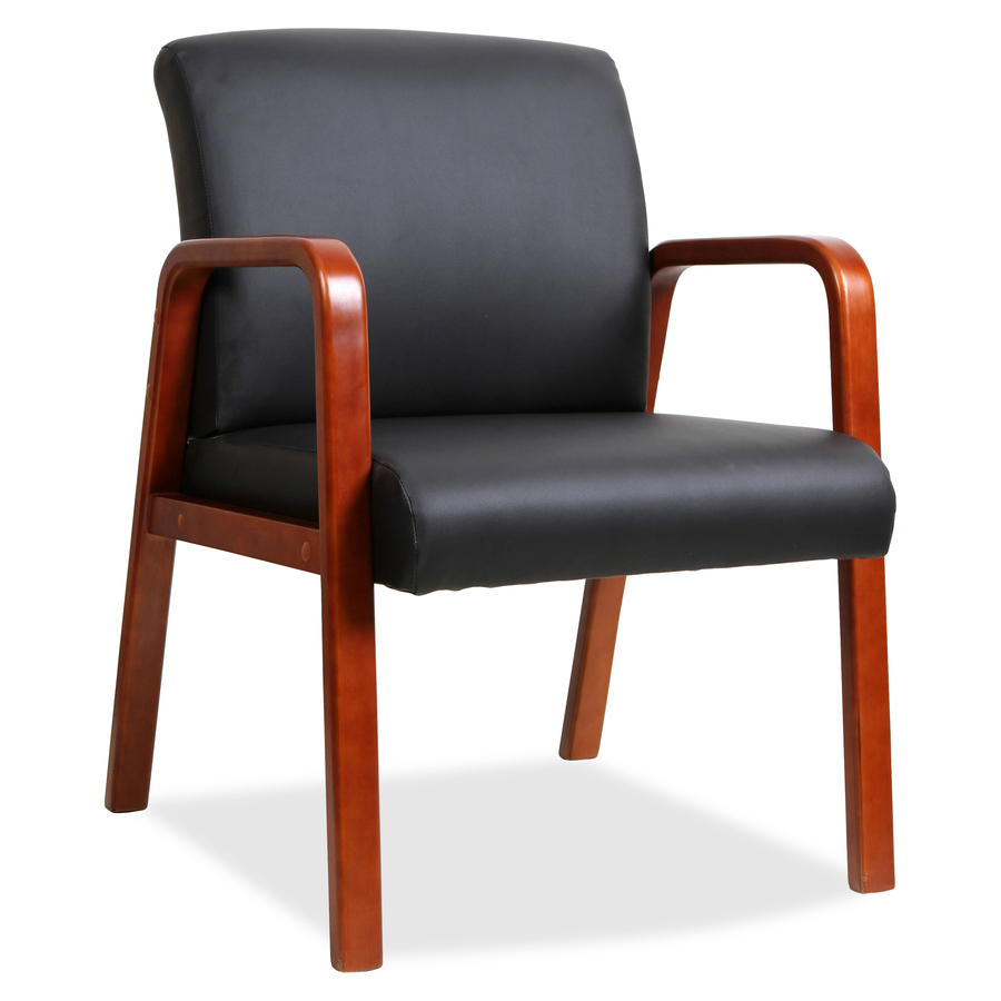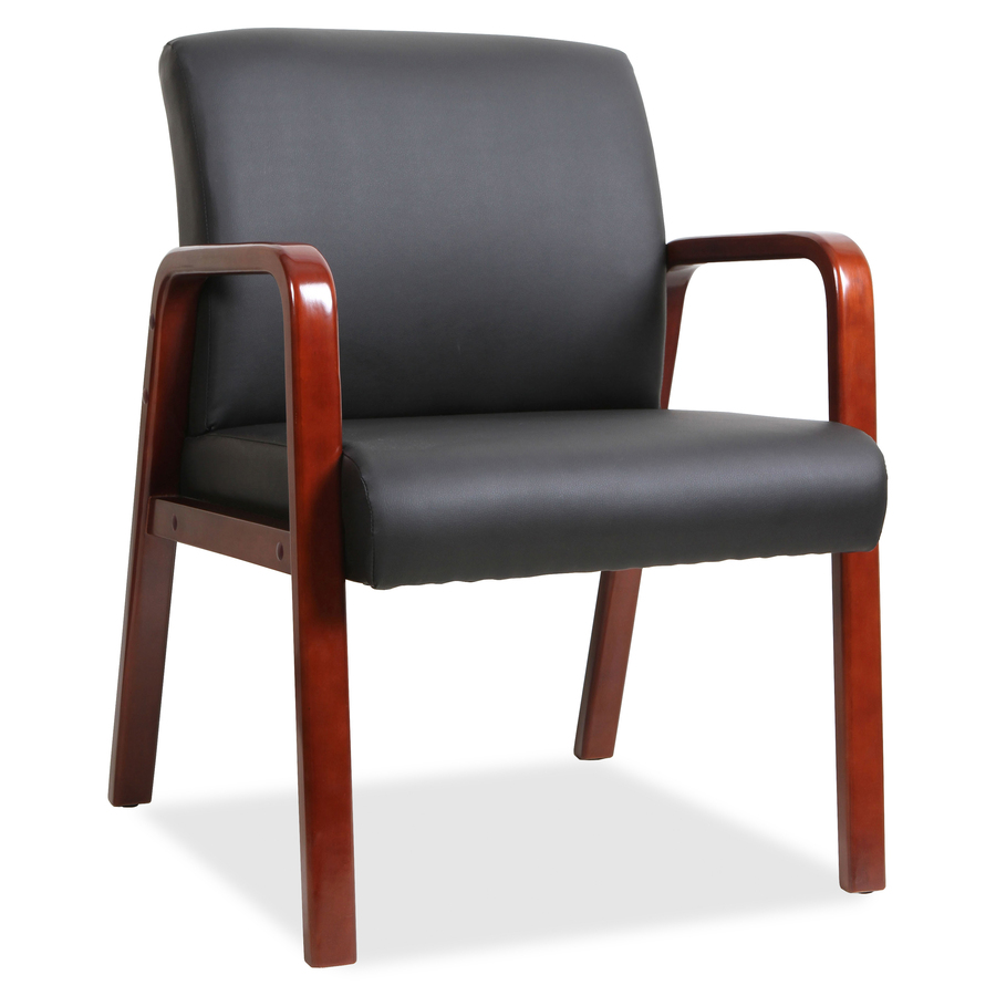 Lorell Guest Chair – Black Bonded Leather Seat – Black Bonded Leather Back – Cherry Solid Wood Frame – Four-legged Base – Armrest – 1 Each
