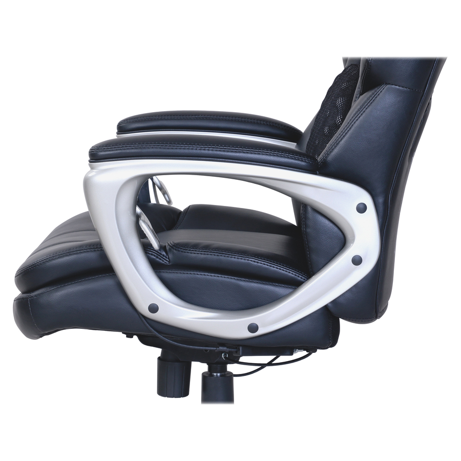 Part of Lorell's Wellness by Design collection, this Accucel Executive Chair is office seating approved by the American Chiropractic Association. Lumbar Accu-pressure promotes increased circulation. Accucel technology provides targeted comfort and support. Dense, EVA convoluted foam in the lower back area features a durable open-mesh covering. Luxurious, black bonded leather upholstery provides a sleek look. Functions include pneumatic seat-height adjustment from 20-1/2" to 24-1/4", tilt (from 102 to 119 degrees) and tilt lock. Arm-integrated fingertip controls allow easier seat height and tilt lock adjustment. 26" five-star nylon base is equipped with 1-24/25" diameter dual-wheel casters for easy chair movement. Seat measures 21" wide x 18-1/2" deep x 6-1/2" thick. Back size is 24-1/4" wide x 27-1/4" high x 6-1/4" thick. Executive chair meets or exceeds BIFMA standards. Weight capacity is 275 lb.