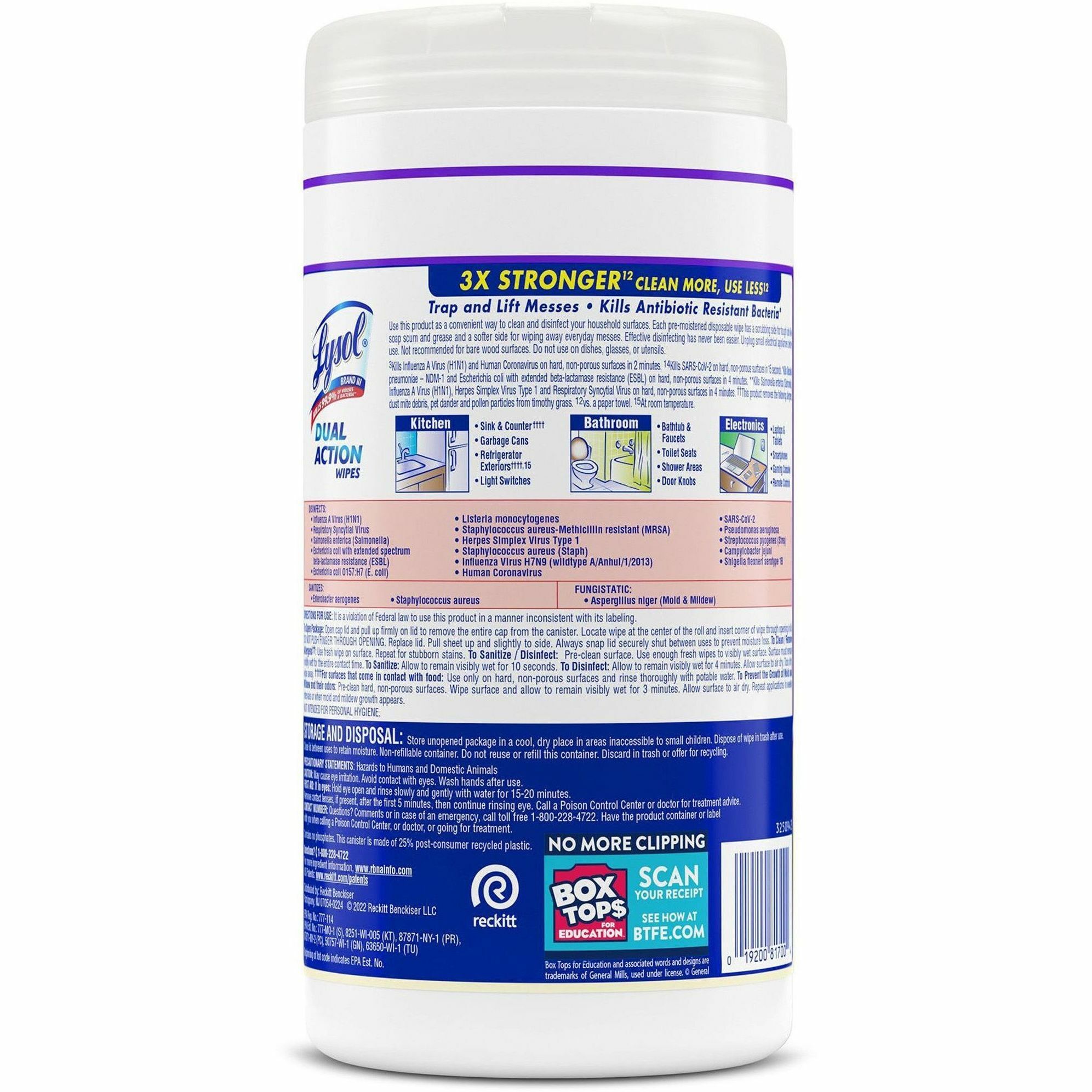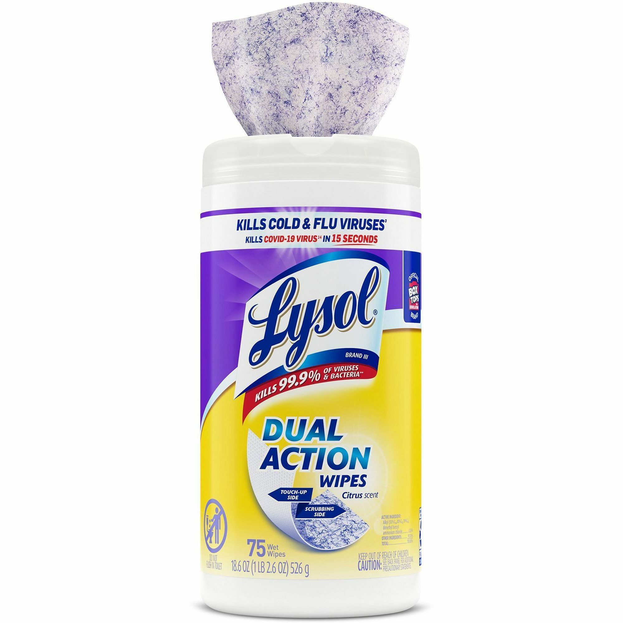Lysol Dual Action Wipes – Wipe – Citrus Scent – 7.25″ Width x 7″ Length – 75 / Canister – 6 / Carton – White/Purple