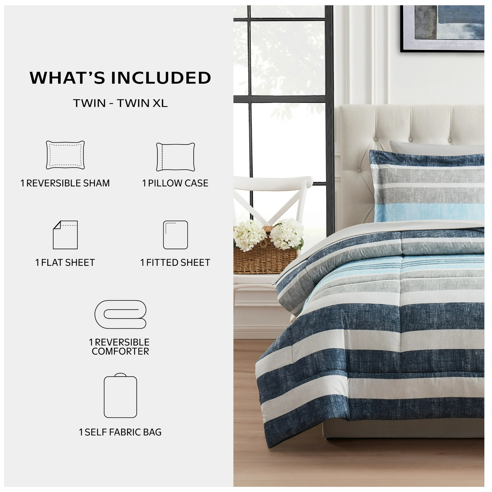 5-piece reversible bed-in-a-bag set including comforter, flat sheet, fitted sheet, pillowcase, and sham. Twin/Twin-XL size.