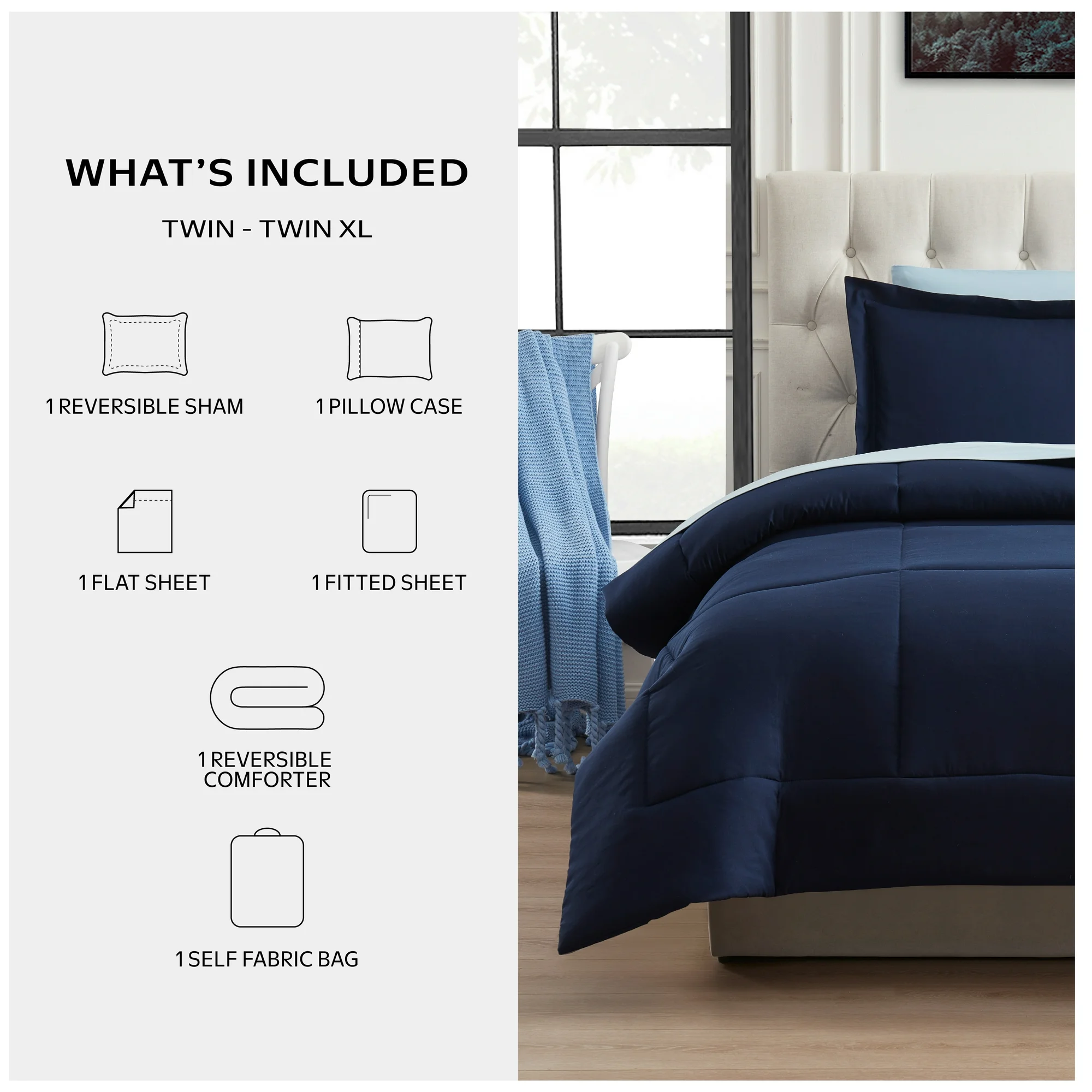 5-piece reversible bed-in-a-bag set including comforter, flat sheet, fitted sheet, pillowcase, and sham. Twin/Twin-XL size.