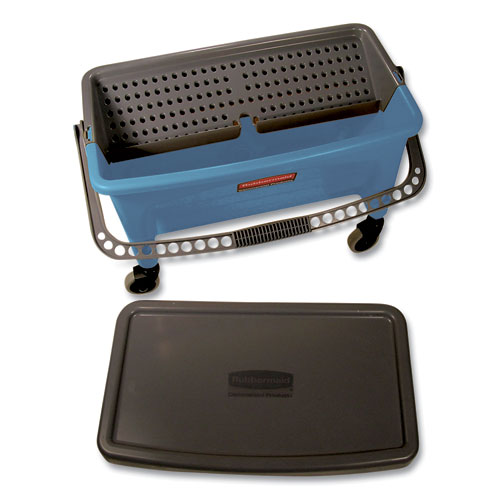 Blue color-coding visually indicates that the bucket is dedicated to floor-finishing tasks. Angled, washboard-surface wall simplifies removing excess finish from your application pad. Lip-mounted notches allow you to prop mop handles up and keep them ready for use. Twist-valve enables easy finish release. Smooth, nonporous surface streamlines cleanup.Package Includes: (1) Lid