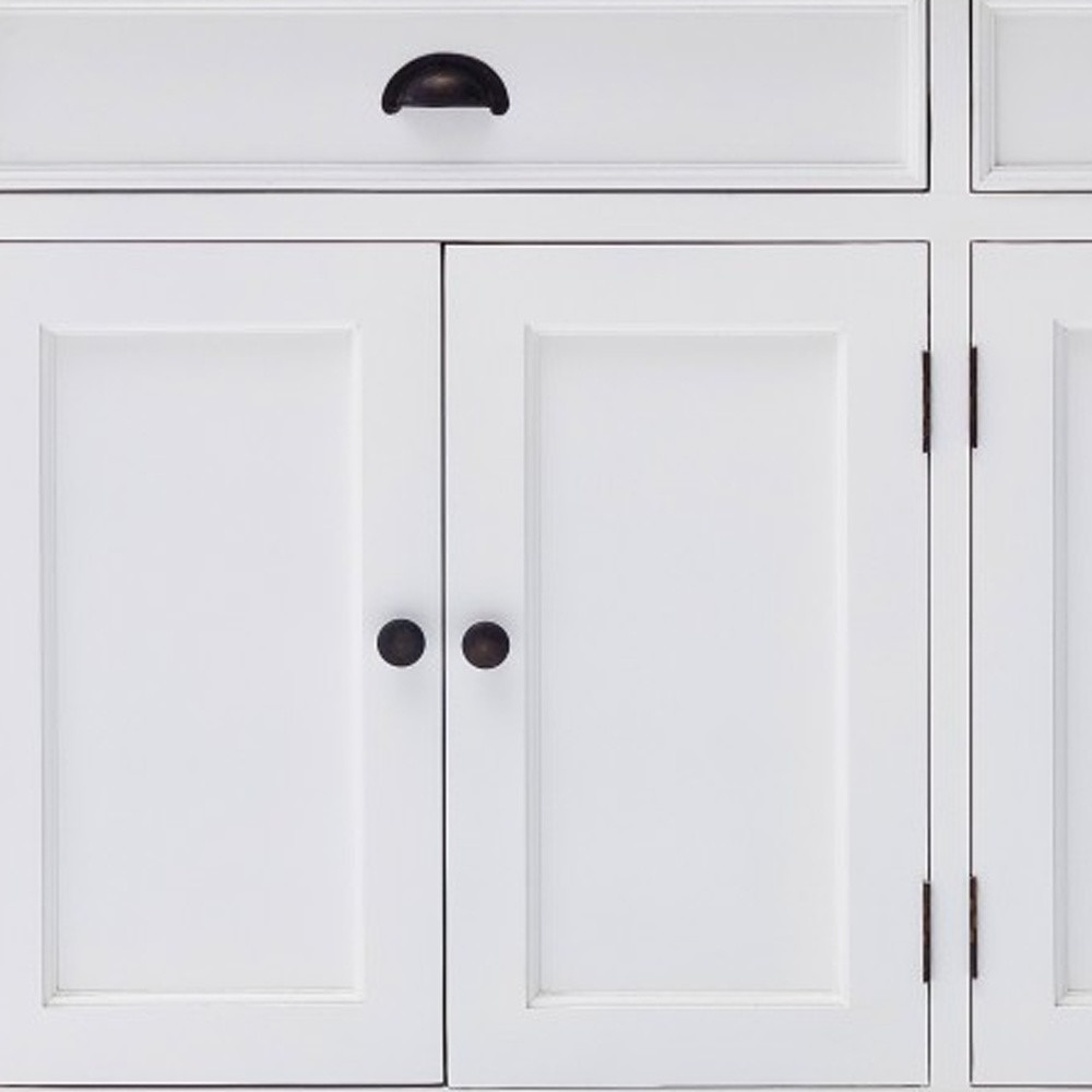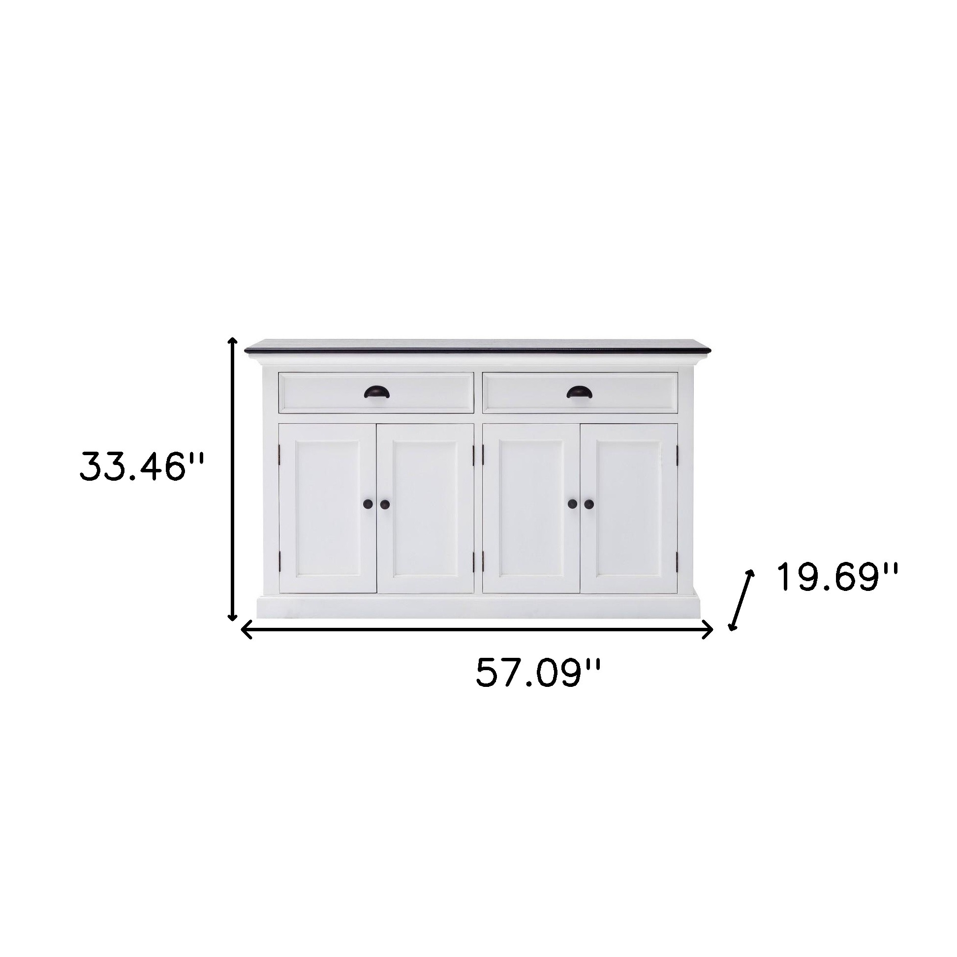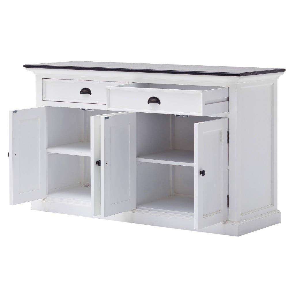 If a stylishly charming and fresh design is what you are going for, then this Modern Farmhouse Black and White Buffet Server will wow you with its simple but classy design lines. This buffet server has been made with the highest quality mahogany MDF and skillfully finished with smooth white and black by expert craftsmen. Transitional in style this piece can go from cozy seaside cottage to chic city living. It has two drawers with black knobs and two doors with internal shelving & black knobs and hinges on the outside. The black knobs and the hinges compliment the rest of the all-white design perfectly and it’ll be perfect for use in the living room, dining area, the hallway or even in the kitchen. You can store all your houseware in the drawers and the shelves inside the doors and lean artwork against the wall on the top surface to jazz up the room. The measurements are 33.46″ x 57.09″ x 19.69″.