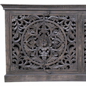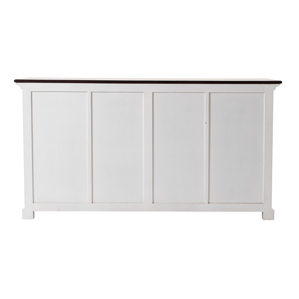 The one buffet server to solve all your storage problems! The Modern Farmhouse Brown and White Buffet Server with Baskets has an antiqued slightly distressed white wooden finish that gives it much charm. It has four pull out drawers and two sets of doors on either side with fixed internal shelving. It also has four fixed open-ended shelves and four hand-woven baskets of the highest quality. The dark brown top surface has a smooth wooden finish and can also be used to store the four baskets, which will free up the shelves to store even more stuff! The measurements of the buffet server are 33.46″ x 62.99″ x 19.69″.