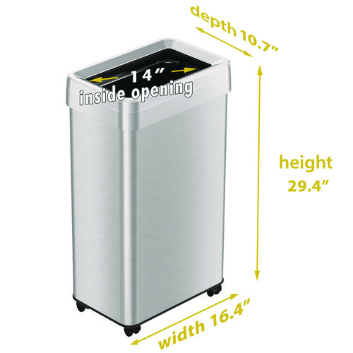 Upgrade your facility with our sleek and efficient open top trash cans, now featuring removable caster wheels for ultimate mobility and quick deployment! These bins are designed for swift and easy disposal with their convenient open top lids. Dual odor filters keep your surroundings fresh and clean, making them perfect for offices, hotels, government buildings, and hospitals. The durable stainless steel body and ABS plastic lid provide a stylish and long-lasting solution, while the slim, space-saving design integrates seamlessly into any professional setting. Enhance your space today with these practical, elegant, and mobile trash cans.Note: This is a non-returnable item.