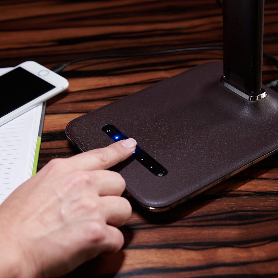 OttLite Wellness Series Renew LED Desk Lamp – 14.8″ Height – 6″ Width – LED Bulb – USB Charging, Adjustable Brightness, Touch-activated, Adjustable Height, Adjustable Knob, Alarm, ClearSun LED, Energy Saving – 400 lm Lumens – Faux Leather, Chrome, Plastic – Desk Mountable – Brown – for Tablet, Phone, Desk
