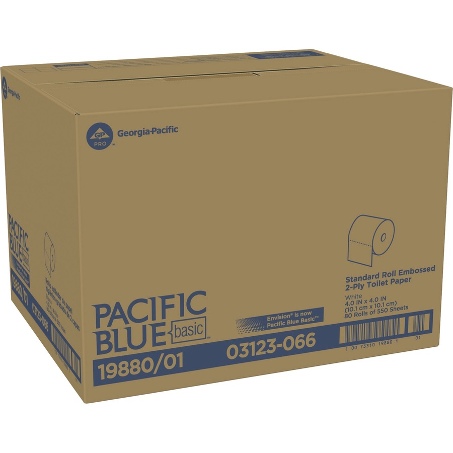 Pacific Blue Basic Standard Roll Embossed Toilet Paper – 2 Ply – 4.05″ x 4″ – 550 Sheets/Roll – White – Soft, Durable, Absorbent – For Office Building, Healthcare – 80 / Carton