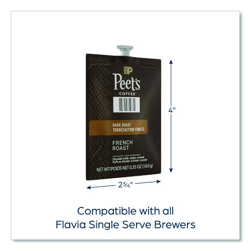 Peet’s® darkest roast is intensely bold and flavorful with pronounced smoky overtones and a pleasant bite. Only top-quality Arabica beans from the highest altitudes of prime Latin American growing regions are selected for the French Roast. Our brewing process, where nothing touches the ingredients other than hot water, ensures your drink does not taste like previous brews. Compatible with FLAVIA® single-serve brewers. For single-serve sustainability, innovative pouches are 100 percent recyclable through Terracycle.Note: This is a non-returnable item.