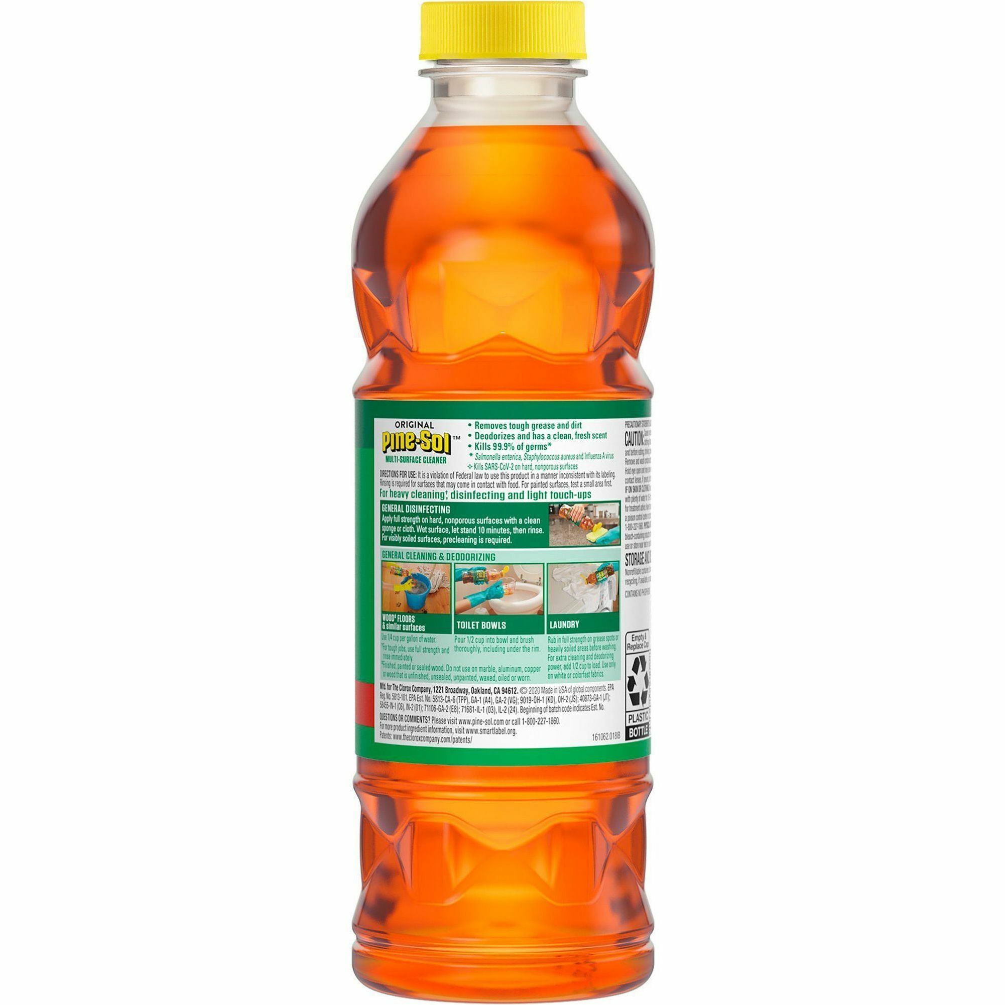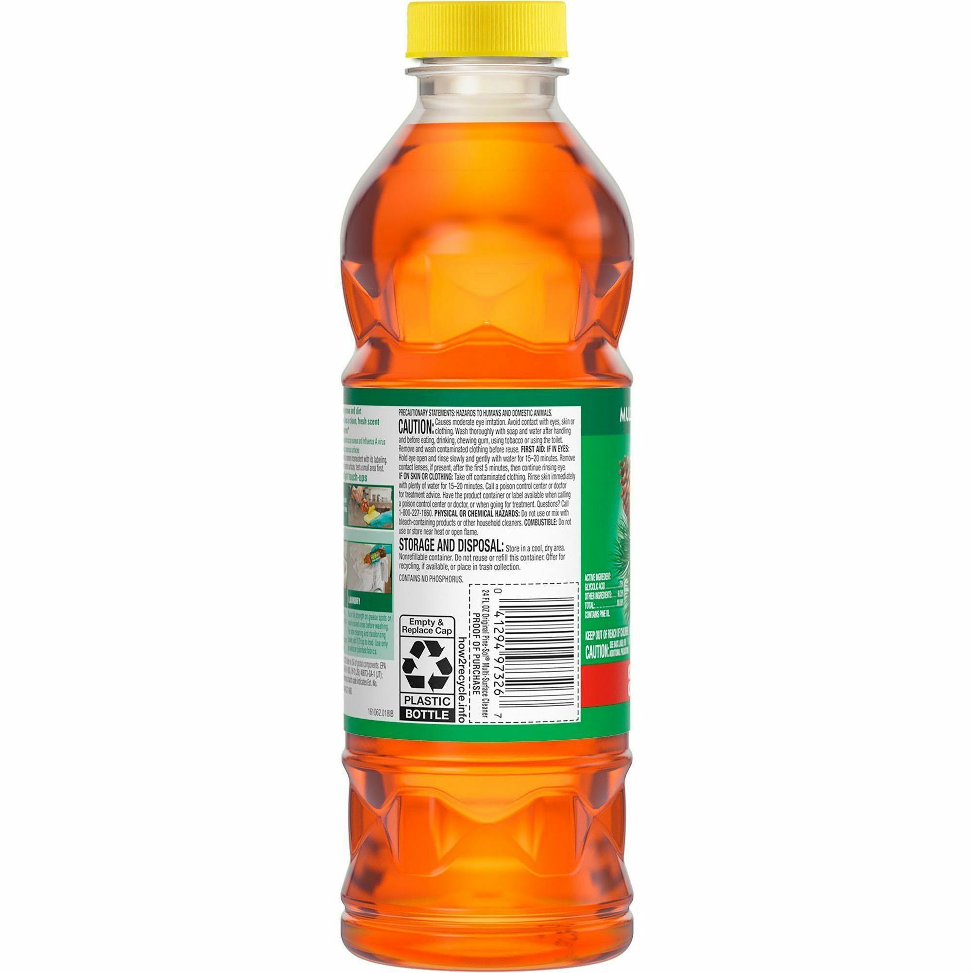 | Marketing Information | <p>With Pine-Sol All Purpose Cleaner, you only need one cleaner to fight dirt, grime and grease. EPA-registered to disinfect and kill 99 percent of germs on most surfaces throughout your home or office, Pine-Sol gives you four times cleaning action and a great, long-lasting scent. It deodorizes and wipes out odor-causing bacteria, leaving a pleasant Pine scent. This concentrated formula cleaner can tackle any challenge. Simply mix Pine-Sol All Purpose Cleaner with water at different strengths to adjust your cleaning power each time, unlike premixed cleaners. It is safe to use on most hard, nonporous surfaces including finished hardwood, ceramic tile, linoleum and plastic. It leaves no sticky residue. Pine-Sol Original Pine can also be used to freshen laundry. With the power of Pine-Sol on your side, you only have to clean once to get the job done right.</p> |