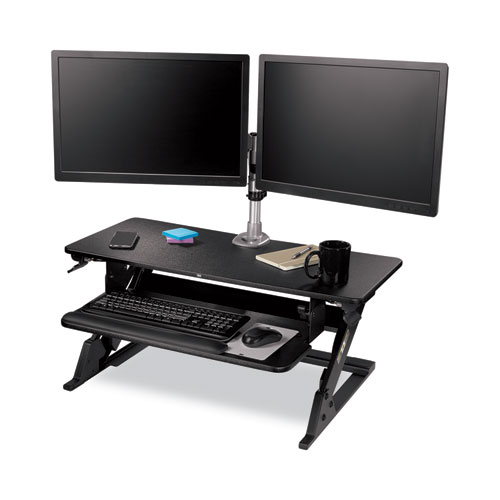 Gas assisted continuous height adjustment allows you to move smoothly and quietly between sitting and standing positions in seconds. Height adjustment range from 6.2” to 20” above the desk accommodates a wide range of users. 10°/-10° keyboard surface tilt to help achieve comfortable typing position. Primary work surface is large enough to fit two 24” monitors and holds up to 35 lb. Includes 3M Gel Wrist Rest for your keyboard and 3M Precise Mouse Pad. Pre-assembled solution eliminates need for installers.Package Includes: 3M Gel Wrist Rest; 3M Precise Mouse Pad