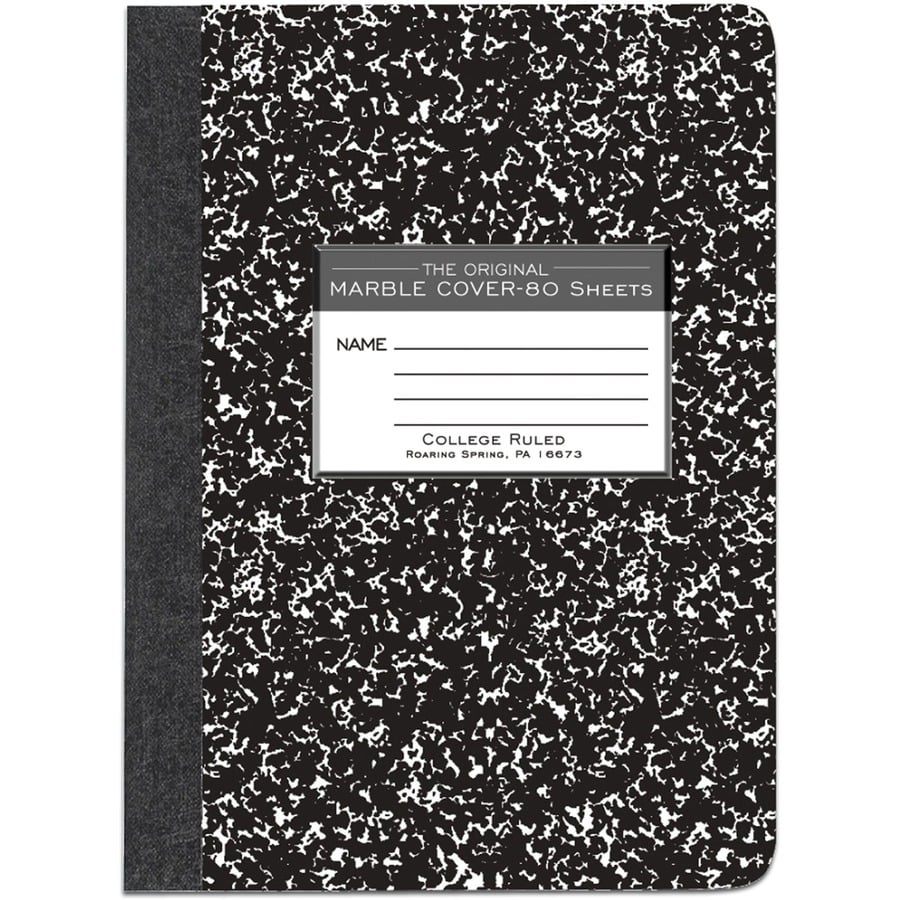 | Marketing Information | Record your notes in this permanently bound composition book, part of the Signature Collection. Premium, white, 20 lb. writing paper is ruled with blue lines and a red margin line. Covers are made of hard white board that is printed in the traditional black marble pattern. Inside cover is printed with class schedule and other useful information. Each Black Marble Composition Book is center-sewn and tape-bound so sheets are not designed for sheet tear-out. Book contains 80 sheets (7-7/8 x 10-1/4"). |