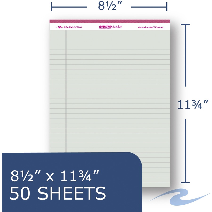 Roaring Spring EnviroShades Legal Pad – 50 Sheets – 100 Pages – Printed – Stapled/Tapebound – Both Side Ruling Surface – Double Line Red Margin – 15 lb Basis Weight – 56 g/m² Grammage – 11 3/4″ x 8 1/2″ – 1.13″ x 8.5″ x 11.8″ – Orchid, Blue, Green, Ivory, Gray, Pink Paper – Blue, Tan, Purple, Red, Green, Gray Binding – Chipboard Cover – Recycled – 6 / Carton