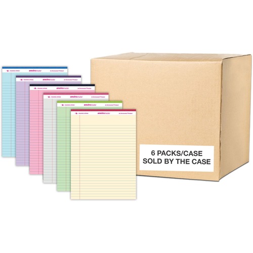 Brighten up your desk using these writing pads with color paper. Each Enviroshades Legal Pad contains smooth, pastel, 15 lb. recycled paper features legal ruling in blue and red double-margin lines. Sheets are microperforated for easy removal. Thick chipboard backs add stability and offer writing support. Sheets and backs are stapled and tapebound.