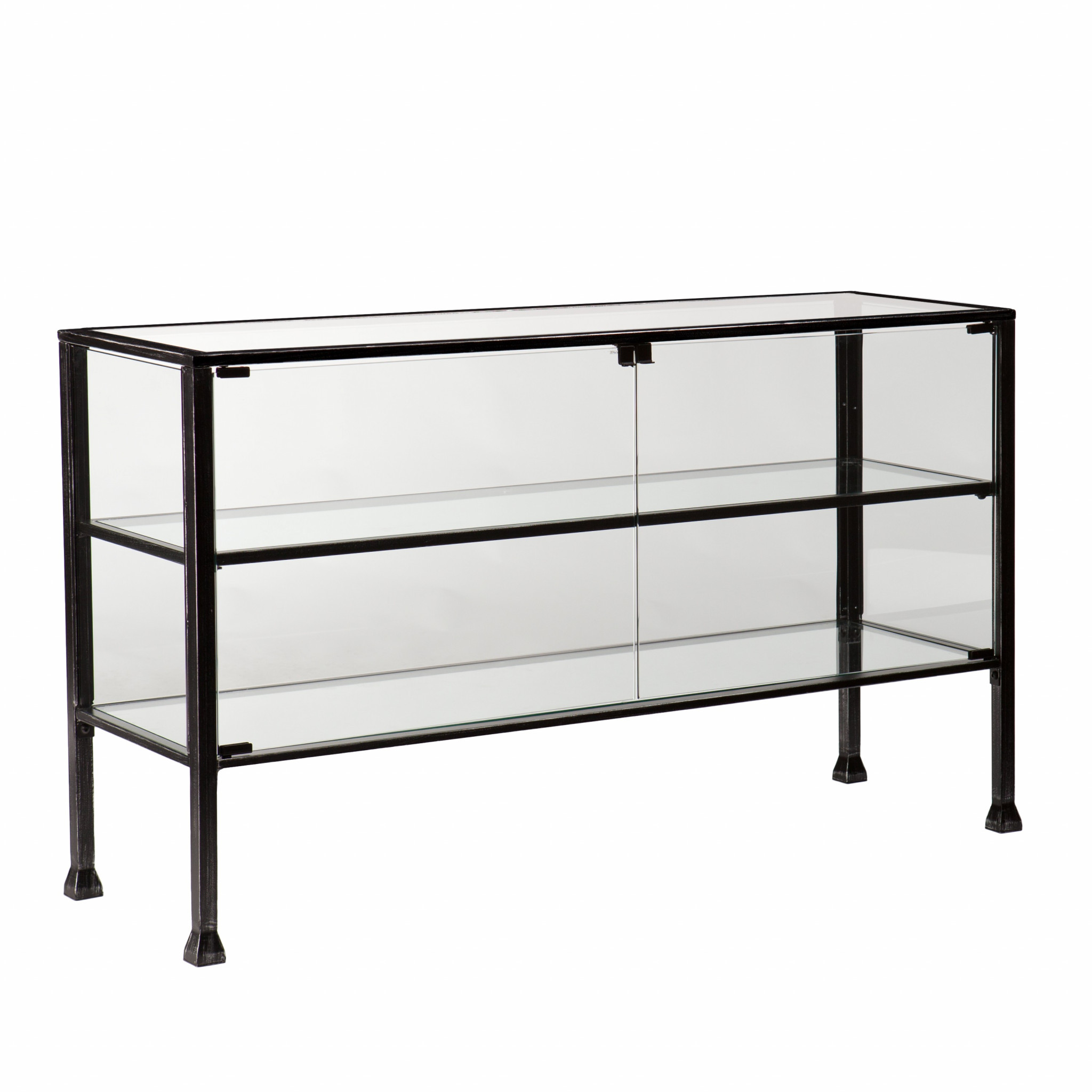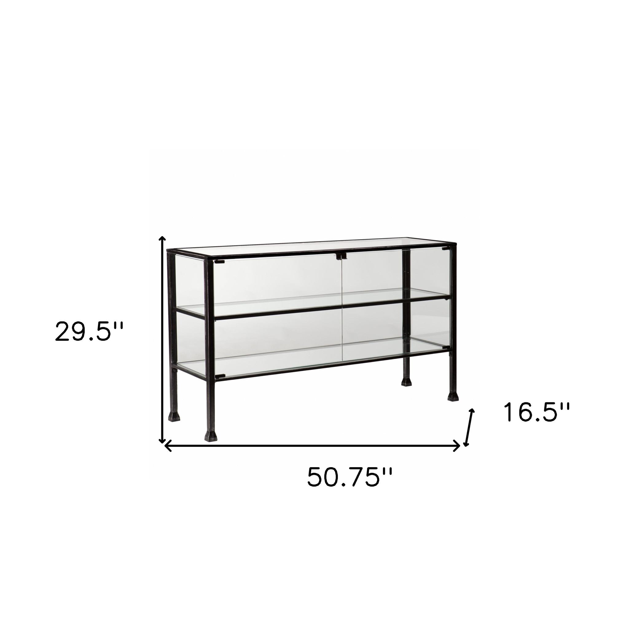 This unqiue Rustic Black and Glass Double Door Cabinet is a unique way to keep your treasures on display and safe from falling and dust. Sleek in design the rustic and distressed black finish stel houses two long inner shelves and magnetic closing doors. This cabinet would be a great large terrarium for your lowlight houseplants and succulents, or a showcase for your precious collectibles. 29.5″ x 50.8″ x 16.5″