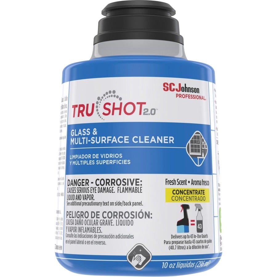 | Marketing Information | <p>Part of the TruShot 2.0 Mobile Dispensing System, TruShot 2.0 Glass and Multi-Surface Cleaner delivers exceptional cleaning. It removes dirt, grease, oils, dust, grime and other soils on washable surfaces: glass, windows, mirrors, aluminum, walls, sinks, countertops, cabinets and other exterior surfaces. Cleaner leaves a streak-free shine and a fresh, clean scent. Spray and wipe dry with a reusable cloth or rubber squeegee. Portable, no-spill, 10 fl. oz. cartridge features an integrated metering system that provides worry-free dilution delivery of up to 43 in-use quarts. Only use this concentrated cleaner with the TruShot 2.0 trigger dispenser item 311981 (not included). Snap cartridge directly into the trigger dispenser. Easy-to-use system requires no mixing, measuring or stopping, and its fully intuitive design will have cleaning crews using it in minutes. Dispenser's onboard, 10 oz. water reservoir easily fills at any water source, reducing re-supply trips.</p> |