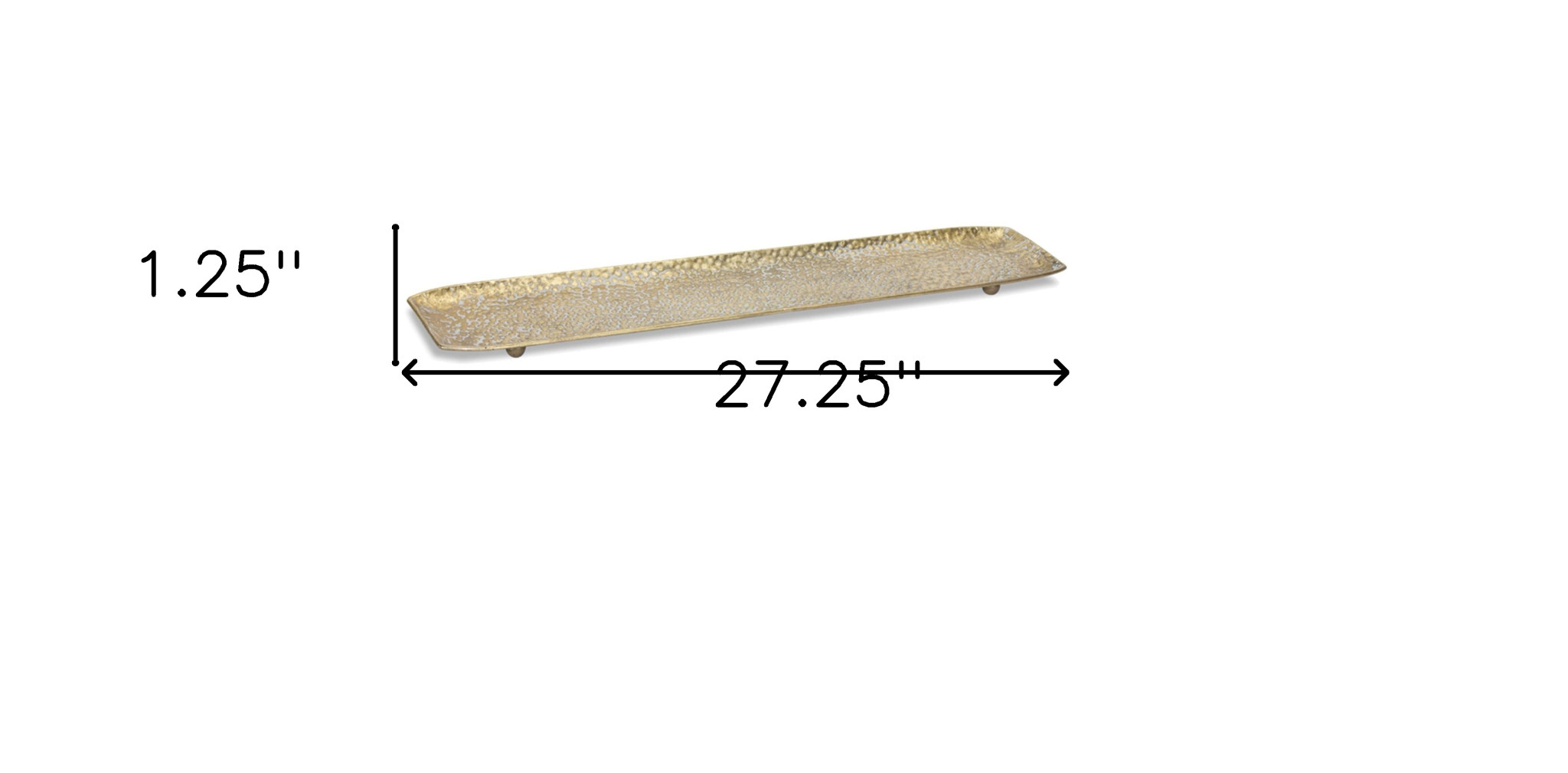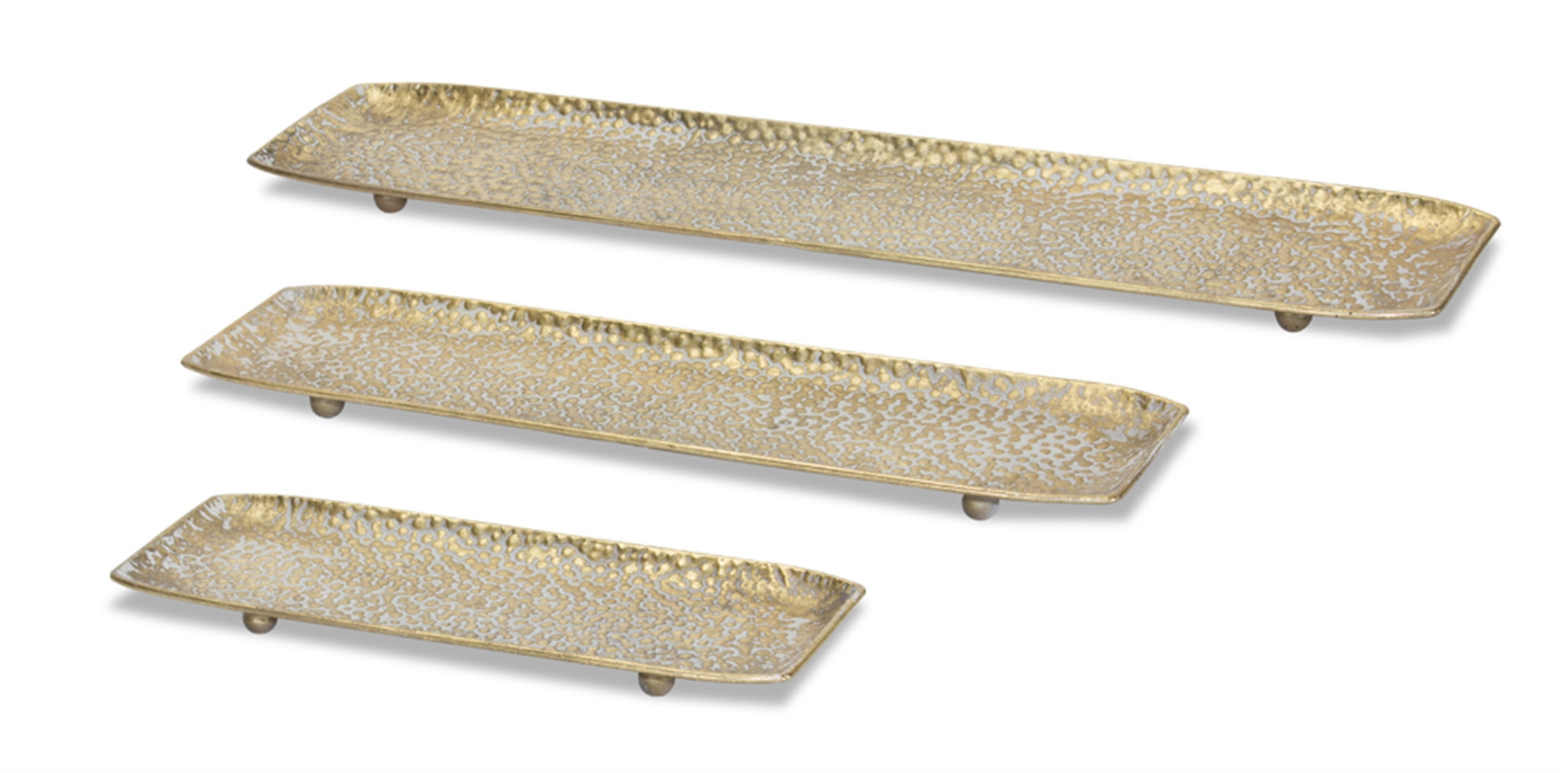 Freshen up your space with this convenient and good looking set of three gold metal serving tray. Crafted from sturdy and durable metal, this rectangular serving tray is versatile enough to blend with a variety of color palettes and aesthetics. This serving tray has a food safe finish. This serving tray arrives as a set of three giving you the versatility to use together or separately. 1.25-inch H x 27.25-inch W x 6-inch D