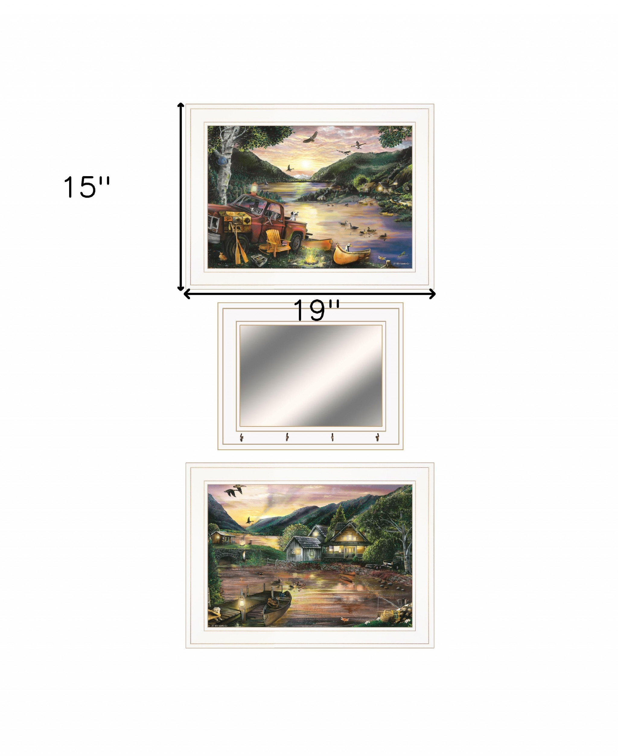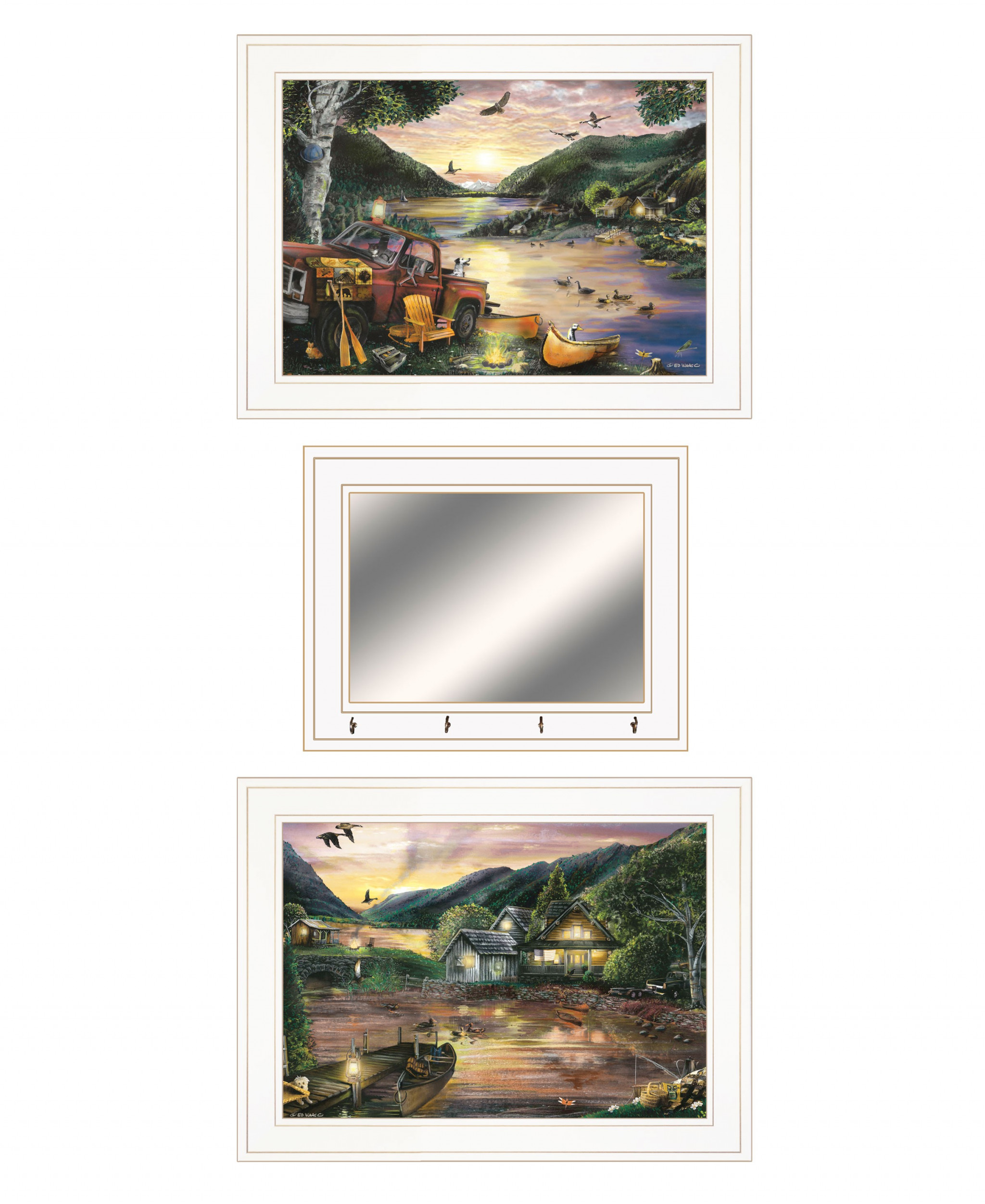 Bring some sizzle to your space with this eye-catching set of three lakefront camping 1 white framed print wall art. This print is a visual artistic expression that allows you to decorate your space in style. Reproduced for you on paper, this hanging decorative accent will be a trendy and fashionable way to dress your walls. Hang on your wall to add some up to date fashion and decoration. Utilize this opportunity to create a focal point in the room with this fabulous wall decor option. 19 inches H x 15 inches W x 1 inches D