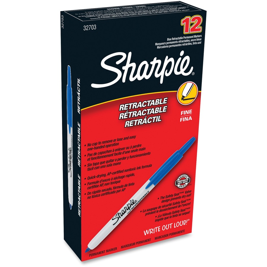 | Marketing Information | Use Sharpie Retractable Marker for easy, one-handed operation. No cap to remove or lose. The Safety Seal valve design provides a superior seal, preventing the marker from leaking and drying out. Durable fine-point tip produces thinner, detailed lines. Quick-drying ink is fade-resistant and water-resistant. Certified AP nontoxic, permanent ink marks on most hard-to-mark surfaces. <p><a id="gfk-spex-minisite" rel="nofollow" href="javascript:void(0)" onclick="javascript:window.open('//content.etilize.com/mini-site/en_us/1025012632.html', '_blank', 'height=800, width=780, resizable=yes, scrollbars=yes, toolbar=no, menubar=no, location=no, directories=no, status=no'), return false, ">More from the Manufacturer</a></p> |