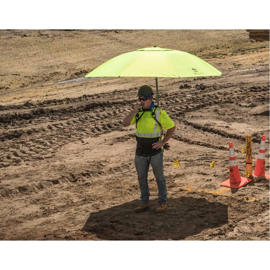 | Marketing Information | <p>Use the 6100 Lightweight Work Umbrella to provide relief from the elements to increase worker productivity and reduce weather-related delays while at the jobsite. Engineered with a powder-coated steel frame, a reinforced weatherproof canopy and 300D polyester material, this lightweight umbrella is built to last. Canopy is made of a polyurethane and ultraviolet coatings (UPF 50 plus) for protection against harmful sun exposure. Tilt mechanism provides full sun protection at any hour of the day. Vented canopy maximizes airflow to prevent an umbrella from blowing away. Powder-coated, steel pole and ribs withstand high winds. Pole has four height options with peak height of 92". Secure umbrella into grass, dirt and other surfaces with ground spike. Easily transport and stow umbrella in the oversized storage bag (included). Pocket on storage bag holds small items for safekeeping. Fluorescent color and reflective accents enhance visibility in low-light or dangerous conditions on the job.</p> |