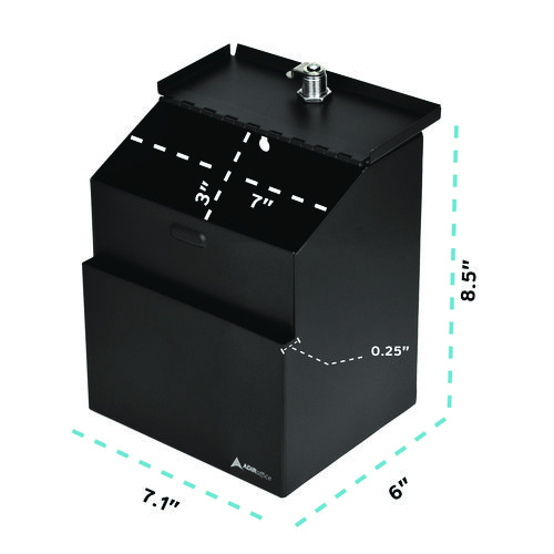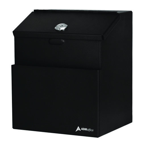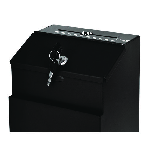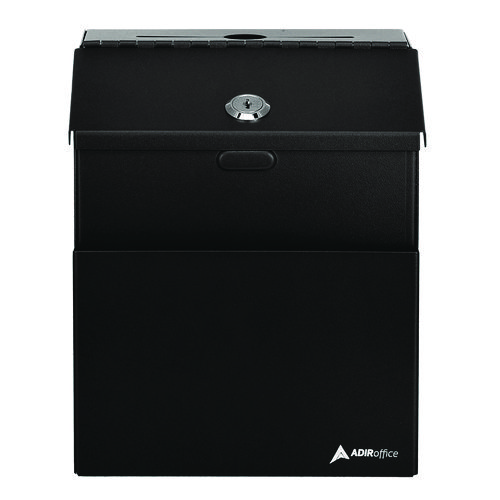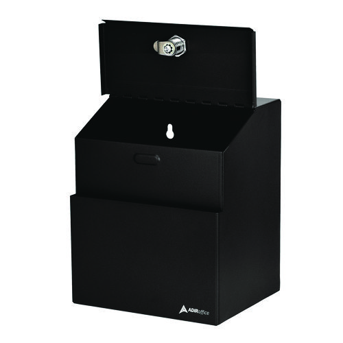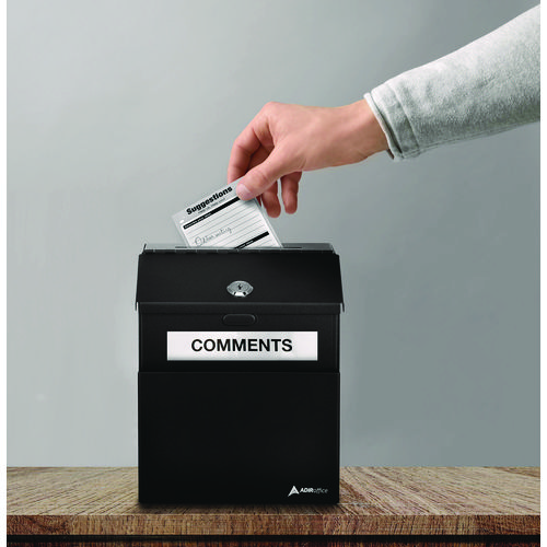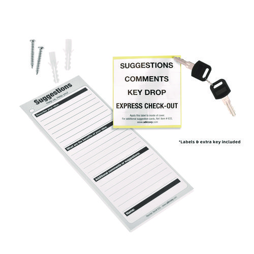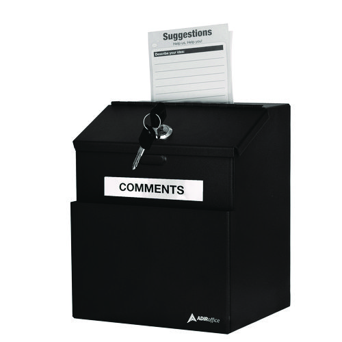 Encourage reliable interaction with clients or employees with this lockable steel suggestion box. The lock ensures confidentiality, which inspires your customers and staff to share their opinions and comments honestly. Compact and lightweight, the box can be placed in any easy-to-reach spot or mounted on a wall to save space. Two keys are included with this purchase for quick and easy access inside. The deposit slot is 4.75″ length x 0.13″ width, making it ideal for dropping off payments, interoffice mail or suggestion cards. Additionally, the opening in the middle is large enough to drop off keys. A front pocket is ideal for holding pens, suggestion cards and small envelopes, allowing for writing suggestions and comments right on the spot. Stick-on labels that dedicate the box for suggestions, comments or for dropping off keys, as well as 25 suggestion cards are also included with this purchase.Package Includes: (2) Keys; (25) Suggestion Cards; Stick on LabelsNote: This is a non-returnable item.