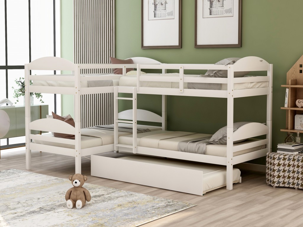 Artistically designed with a ton of charm, the white twin contemporary manufactured wood and solid wood bunk bed is bound to yield a good nights sleep. The entire frame is made from high-quality manufactured wood to ensure its durability. The frame of this bunk is covered in a white hue of casual elegance that suits any kind of style and decor and enhance the presence of your bedroom. This super simple yet elegant bunk bed features twin size beds. Crafted with care and built with safety in mind, the top level includes a guardrail that runs along the upper edge. The integrated structure delivers a high level of stability with a full on stylish appearance. It suits all styles of home decoration, and completes the look of any bedroom. 63-inch H x 119-inch W x 80-inch D